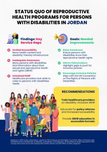 In Jordan, a study conducted by PKF ProGroup and the Higher Council for Affairs of Persons with Disabilities evaluated the availability, accessibility, and adequacy of reproductive health services for persons with disabilities. Surveys across 100 reproductive health centres and 250 persons with disabilities or their caregivers revealed significant service gaps. The findings aim to: