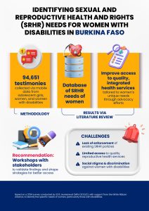 Despite existing laws supporting SRHR and disability inclusion, enforcement remains challenging in Burkina Faso. To address this, SOS Jeunesse et Défis (SOSJD), with support from the White Ribbon Alliance, conducted a survey to identify the specific needs of women, particularly those with disabilities. Key outcomes include: