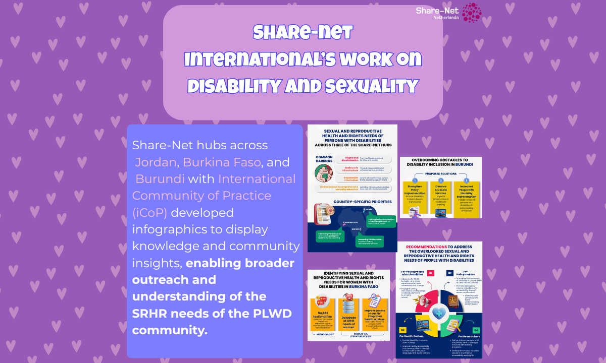This past year, Share-Net hubs across Jordan, Burkina Faso, and Burundi, along with International Community of Practice (iCoP), developed infographics to display knowledge and community insights, enabling broader outreach and understanding of the SRHR needs of the PLWD community. Their work focused on youth with disabilities, specifically the lack of access youth with disabilities have to SRHR information and care. The goal of the project was to source existing information and data on the SRHR needs of youth with disabilities and amplify their voices through accessible and actionable knowledge products.